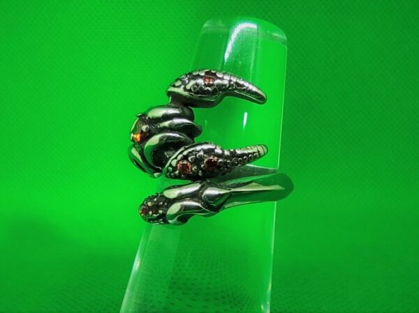 Au centre de cette alliance gothique se trouve un scorpion enroulé, symbole de puissance et de mystère. Les détails soigneusement ciselés mettent en valeur la silhouette majestueuse du scorpion, ajoutant une touche saisissante à votre style. Les 7 brillants rouges incrustés dans la bague captent la lumière de manière hypnotique, créant un éclat intense qui contraste magnifiquement avec l’obscurité de l’alliance.